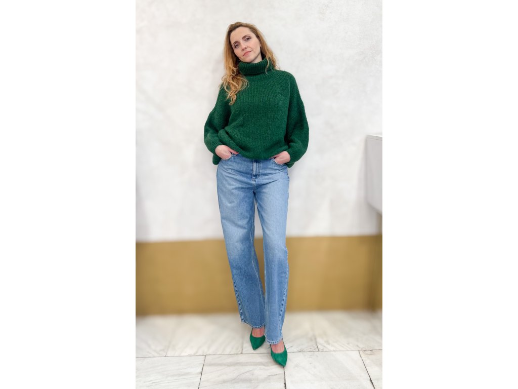 Jeansové kalhoty s vysokým pasem, rovného střihu. Jsou vhodné pro postavy se štíhlým pasem.