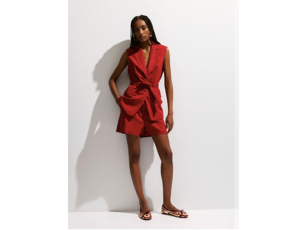 Krásný komplet vesty a kraťas se krásně hodí v letních dnech nejen do kanceláře, ale i na procházku městem. Je vhodný spíše pro vyšší postavy.