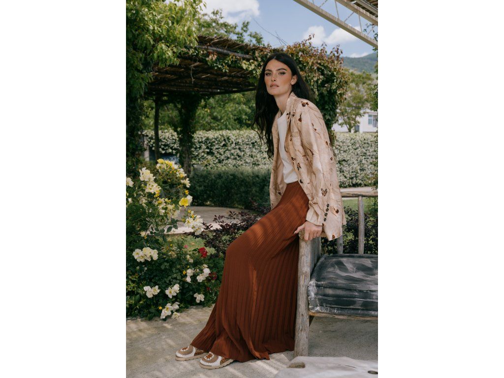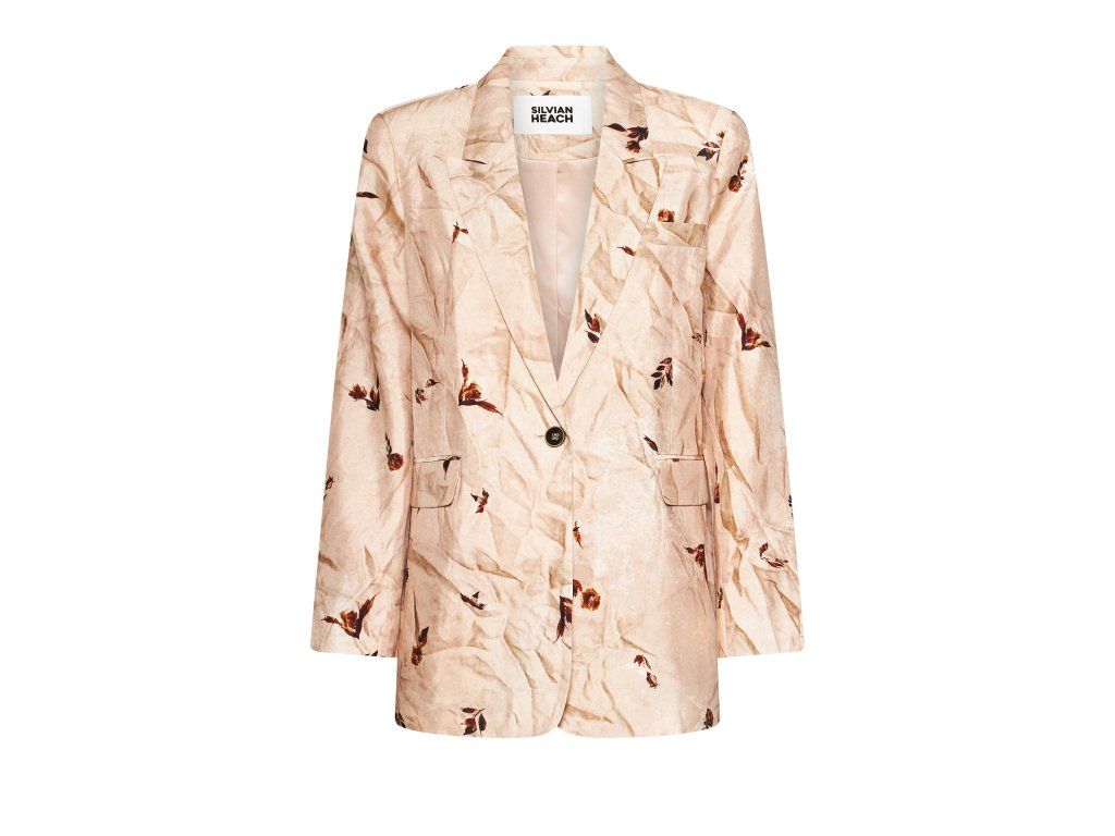Blazer od Silvian Heach, který přináší romantický nádech do každodenního šatníku. Vzdušný oversized střih v teplé béžovo-pudrové barvě zdobí jemný all-over potisk rozptýlených květů v tónech hnědé a terakoty — vzor evokuje dojem zmačkaného hedvábí, který dodává kousku výraznou, uměleckou texturu.